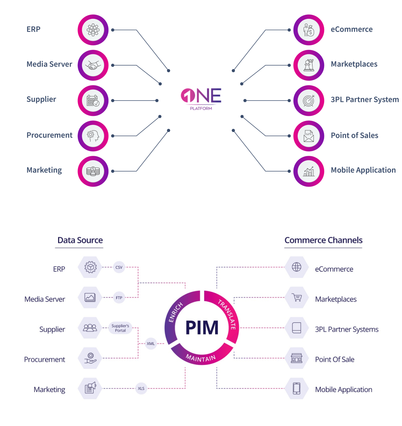 One PIM este o soluție software de gestionare a informațiilor despre produse. Acesta colectează și stochează informații despre produse din surse multiple și le optimizează pentru publicare pe mai multe canale de vânzare. Funcționează prin integrarea cu diferite platforme și sisteme pentru a centraliza datele despre produse.